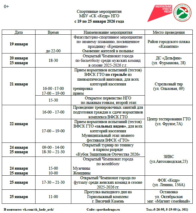 КАЛЕНДАРЬ мероприятий Спортивного клуба «Кедр» с 19 по 25 января 2026 года
