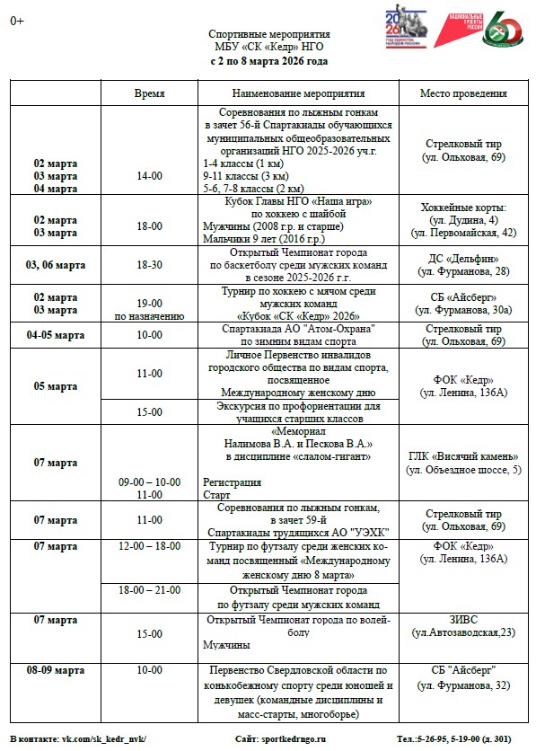 КАЛЕНДАРЬ мероприятий Спортивного клуба «Кедр» с 02 по 07 марта 2026 года